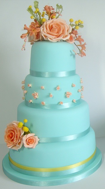 She loves conventional colour combinations like traditional colours for wedding cakes, such as white and pink. She also loves seeing unusual or little-used colour combinations like the latest wedding cake design she has finished (blue cake with orange roses and freesias).