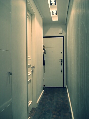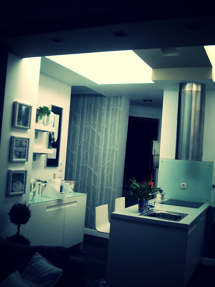 In the process of the new design scheme, simple lines were used in conjunction with white walls and white surfaces, in order to give the illusion of a larger space. The only element that was kept from the old apartment was the outer shell and that in fact was thermal and sound proof treated. Moving on with a client-oriented design, considering the habits and aesthetics of the new users, the brand new apartment arrangement was composed of a master bedroom, a home office, an open plan living room and kitchen area, as well as of a significantly bigger bathroom than the former one. The bathroom included a built-in shower with marble tile coating that was secluded by transparent security glass panels.
