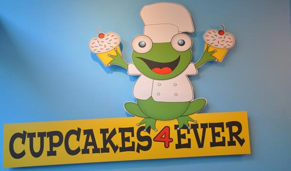 The choice of color palette has been created in harmony with existing logos, which include a happy, playful frog character with cupcakes, a boldly printed shop name in bright yellow and red, along with slogan: “love at first bite”.