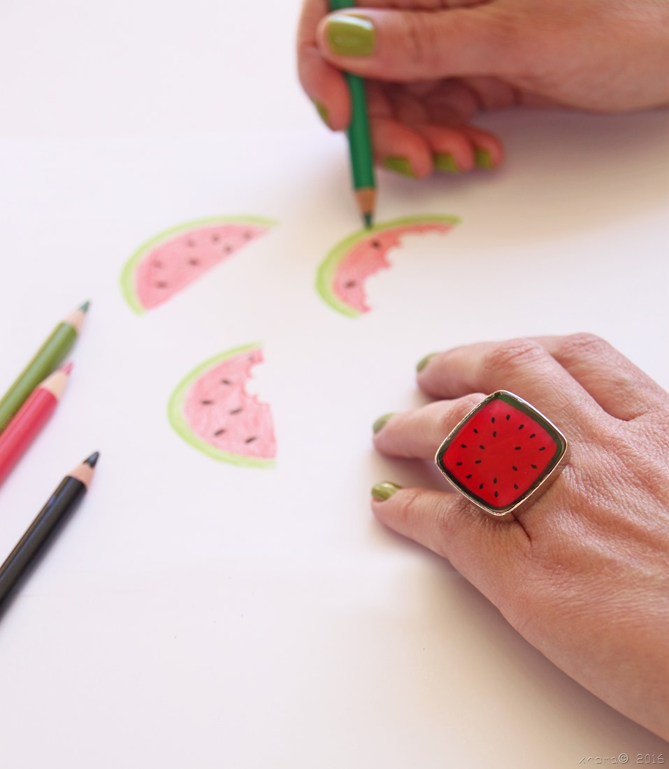 Η δημιουργία κοσμημάτων προέκυψε ξαφνικά, λόγω της … τελειομανίας μου: πολλές φορές αναζητούσα ένα δαχτυλίδι (είναι το κόσμημα που φοράω περισσότερο απ’ όλα) με το τέλειο χρώμα, με κάποια συγκριμένη απόχρωση που είχα στο μυαλό, αλλά, φυσικά, ποτέ δεν έβρισκα ακριβώς αυτό που είχα στο νου. Έτσι, άρχισα να αναζητώ τεχνικές, να δοκιμάζω, να πειραματίζομαι, ώσπου με κέρδισε η τεχνική του υγρού γυαλιού, μιας διάφανης ρητίνης, που με την προσθήκη κατάλληλων χρωστικών μπορεί να αποκτήσει οποιαδήποτε απόχρωση και τονικότητα και που όταν πήξει παίρνει τη μορφή χρωματιστού γυαλιού.