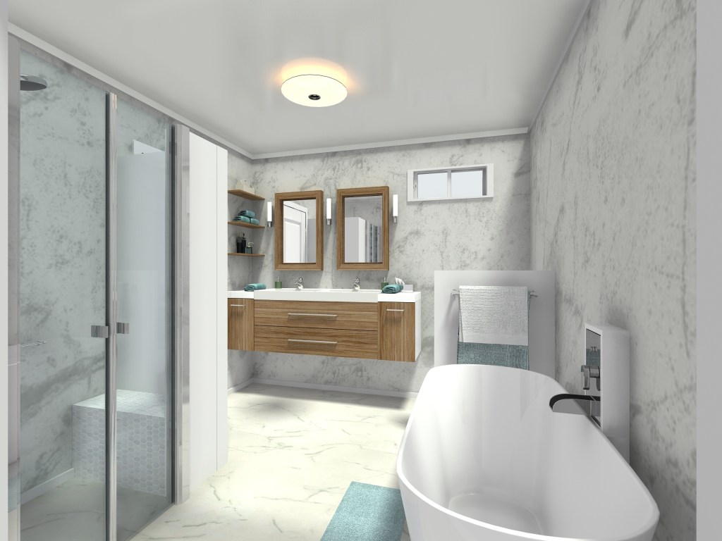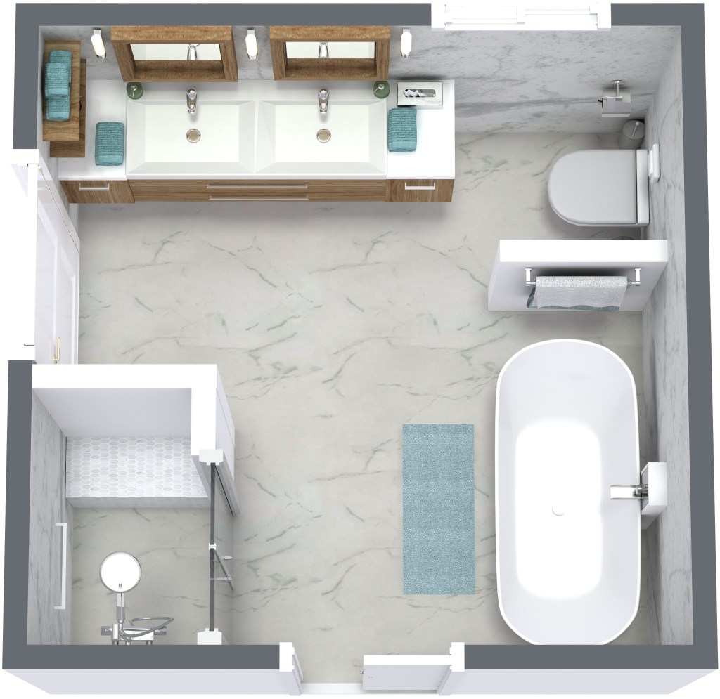 Ζητήθηκε: διπλός νιπτήρας, κρεμαστό ντουλάπι νιπτήρα και αποθηκευτικός χώρος. Απομόνωση της λεκάνης, ξεχωριστό ντους με καμπίνα και μπανιέρα.