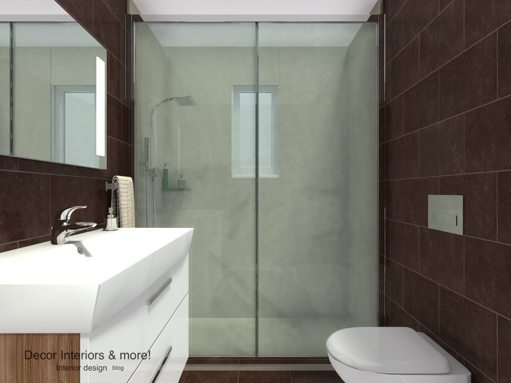 Στο μπάνιο της Κωνσταντίνας η πρόταση έχει ως εξής: διατηρούμε το μπάνιο ως έχει και τοποθετούμε ντουζιέρα που κλείνει με τζάμι και συρόμενη πόρτα. Στο τμήμα της ντουζιέρας δεν έχουμε πλακάκι αλλά επενδύουμε με πατητή τσιμεντοκονία σε απόχρωση που έρχεται σαν συνέχεια με το πλακάκι που υπάρχει ήδη στο μπάνιο: