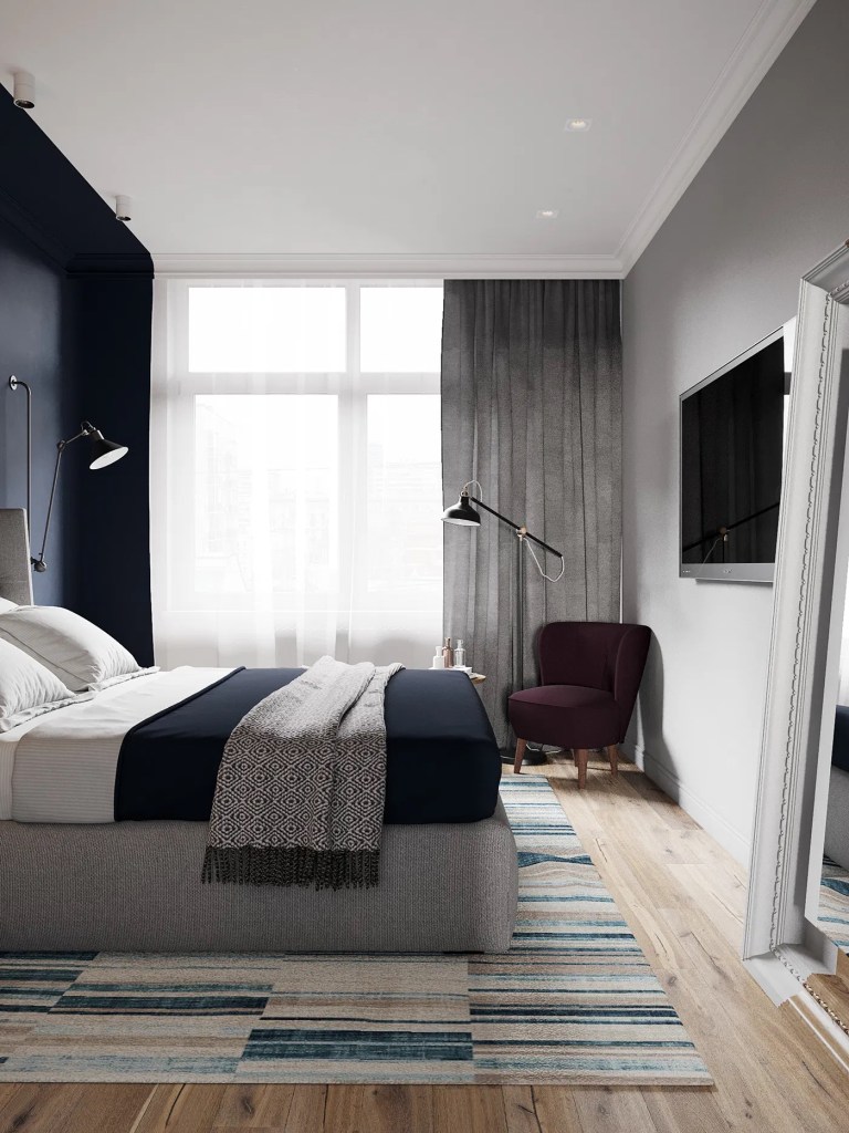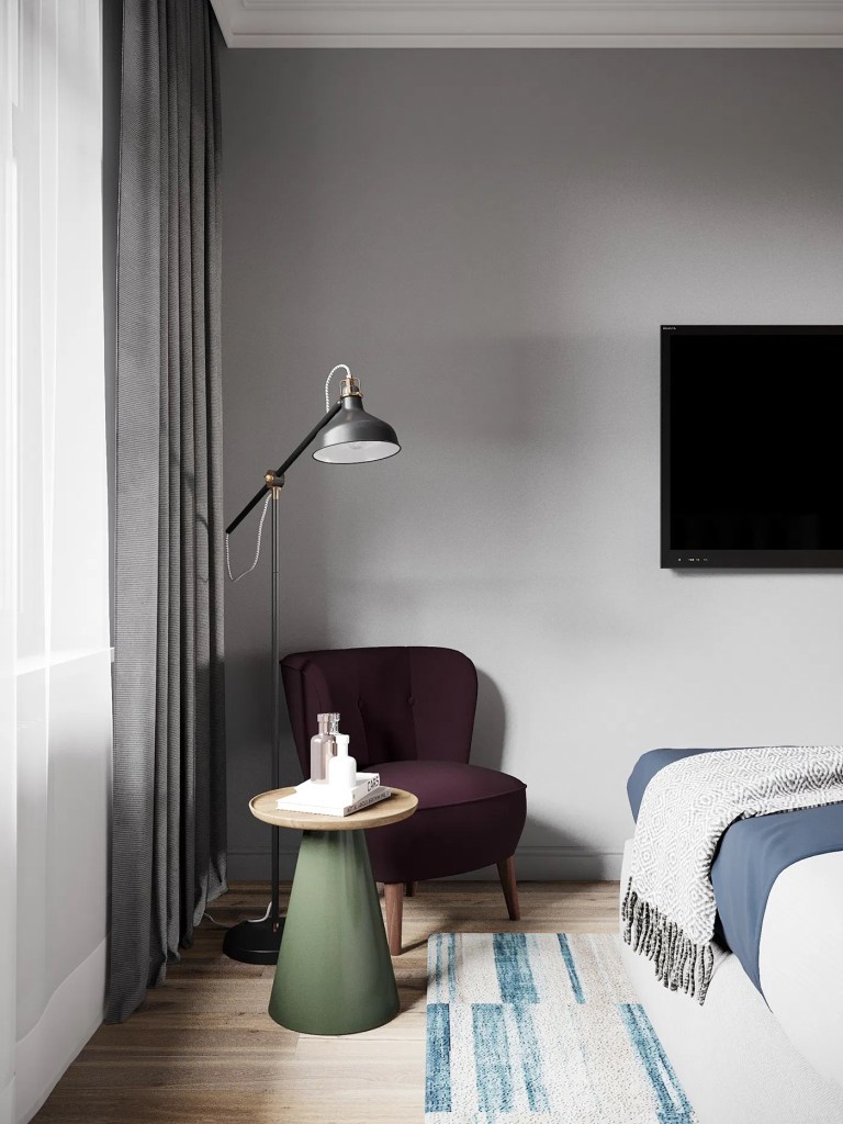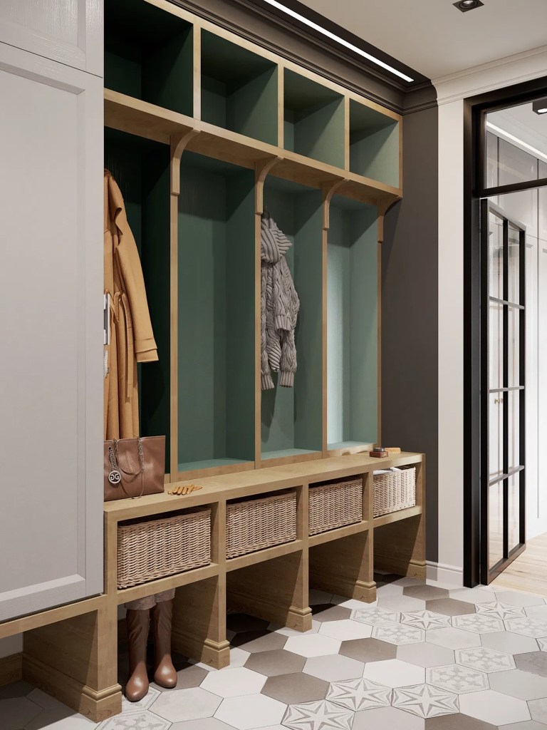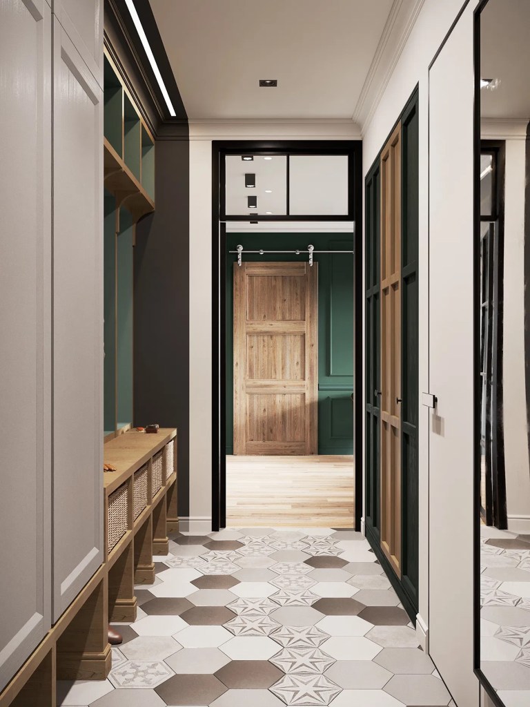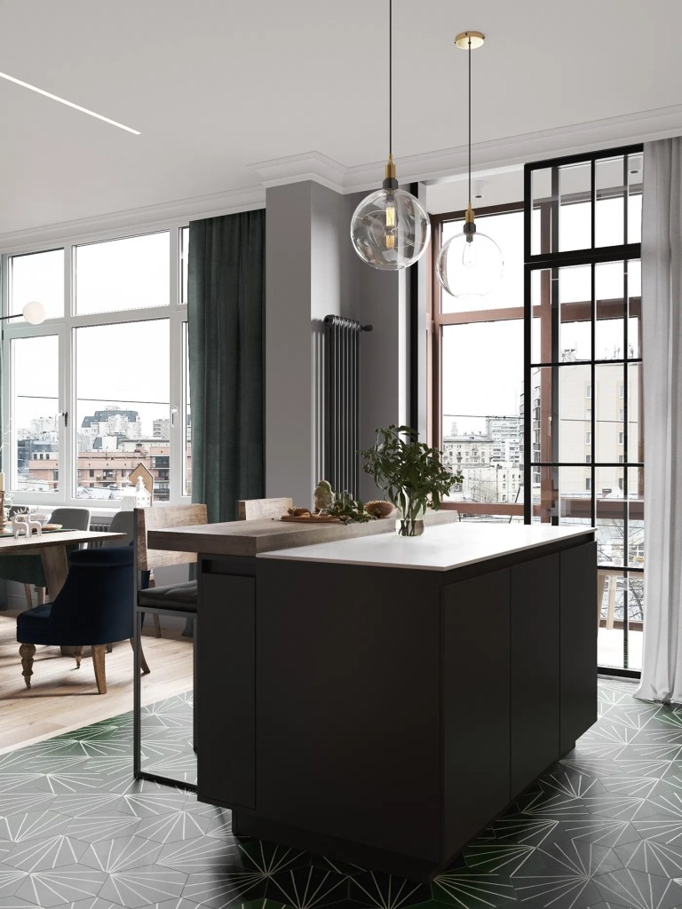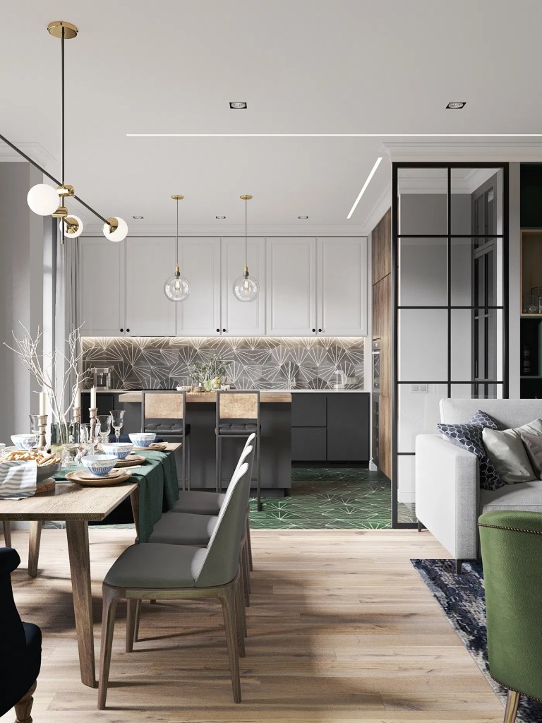 Ένα εντυπωσιακά ανακαινισμένο διαμέρισμα 107m2 στην Αγία Πετρούπολη. Το χαρακτηρίζει το σκούρο πράσινο – κυπαρίσσι – χρώμα, στον τοίχο του σαλονιού, στις ξύλινες κατασκευές και στο δάπεδο της κουζίνας.