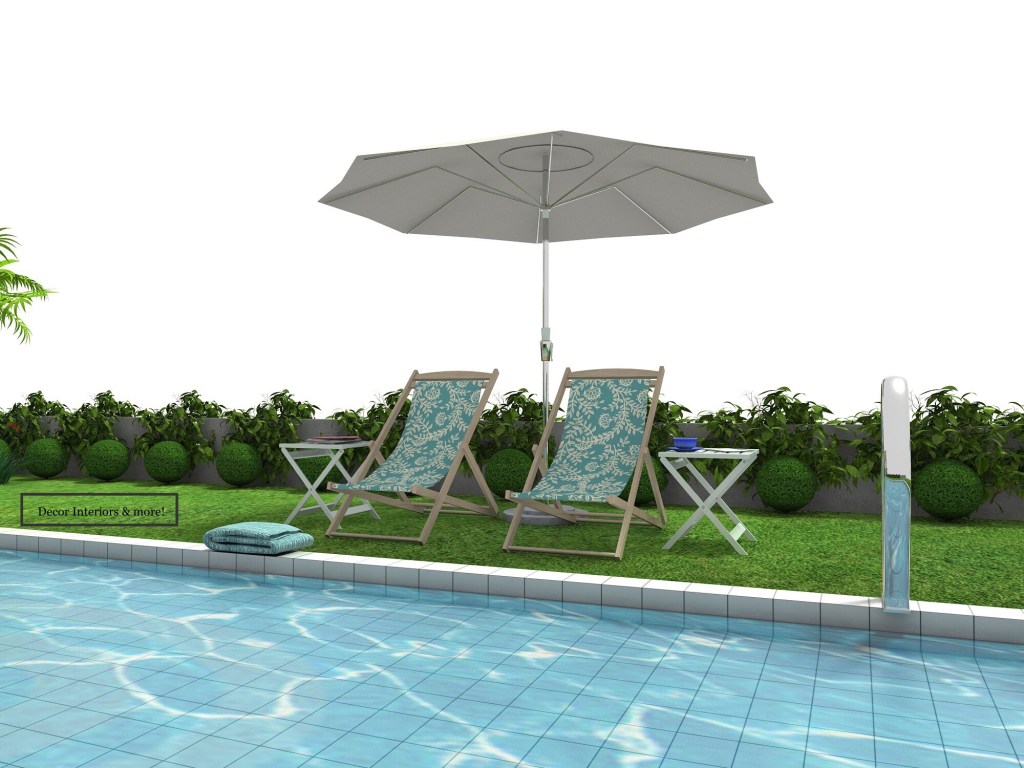 Τρισδιάστατη απεικόνιση διαμόρφωσης εξωτερικού χώρου γύρω από την πισίνα. Σημείο αναφοράς, το μικρής κλίμακας, σπιτάκι της πισίνας όπου αξιοποιείται όλους τους μήνες του χρόνου. Πράσινο, φυτά και φυσικά ντουζιέρα: