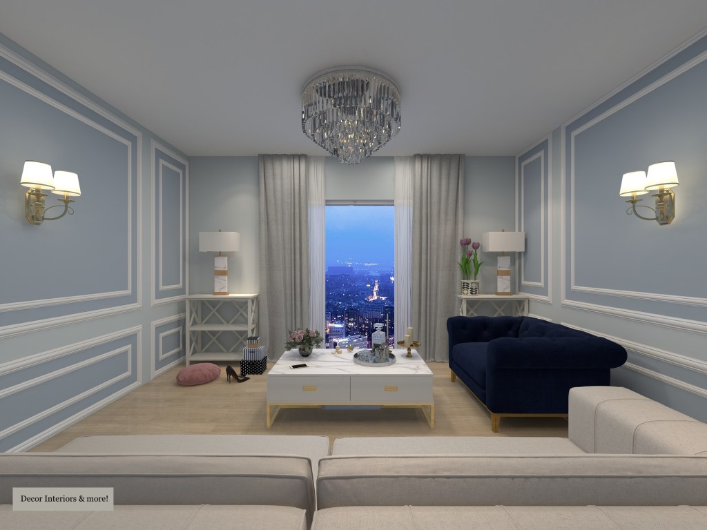 Η παρακάτω μελέτη είναι η τρισδιάστατη απεικόνιση του καθιστικού χώρου σε ένα διαμέρισμα. Κύριο χαρακτηριστικό είναι η επένδυση με γύψινους ταμπλάδες στον τοίχο. Σε λευκό χρώμα οι γύψινες κορνίζες και το βασικό χρώμα είναι μια απόχρωση του γαλάζιου. Τα έπιπλα που προτείναμε είναι σε μοντέρνα γραμμή αλλά δίνουμε ένταση και ζωντάνια με βελούδινες royal blue πολυθρόνες: