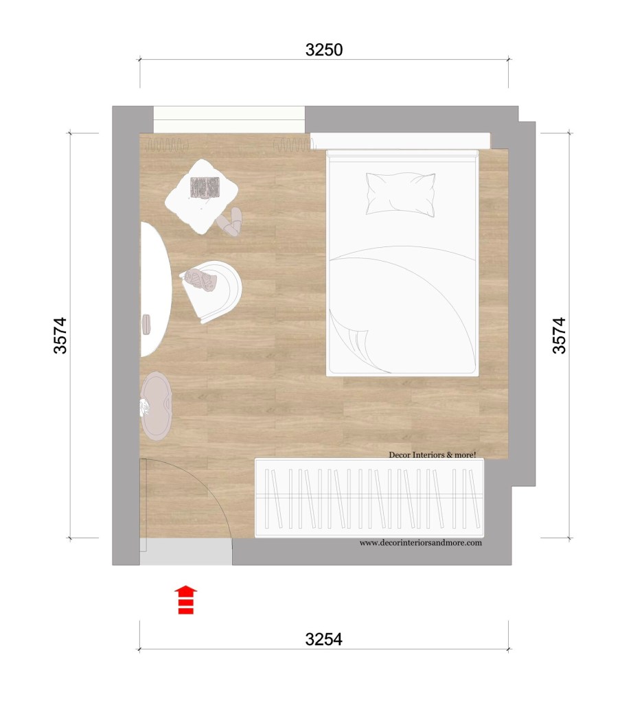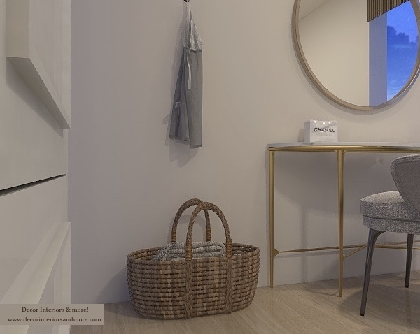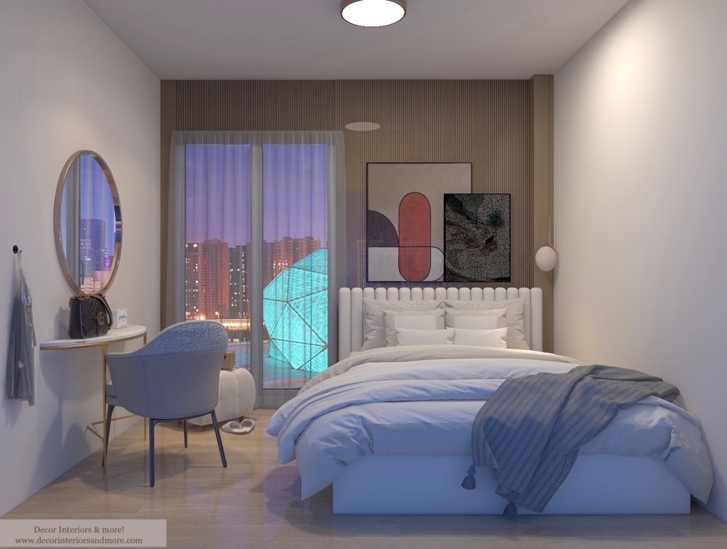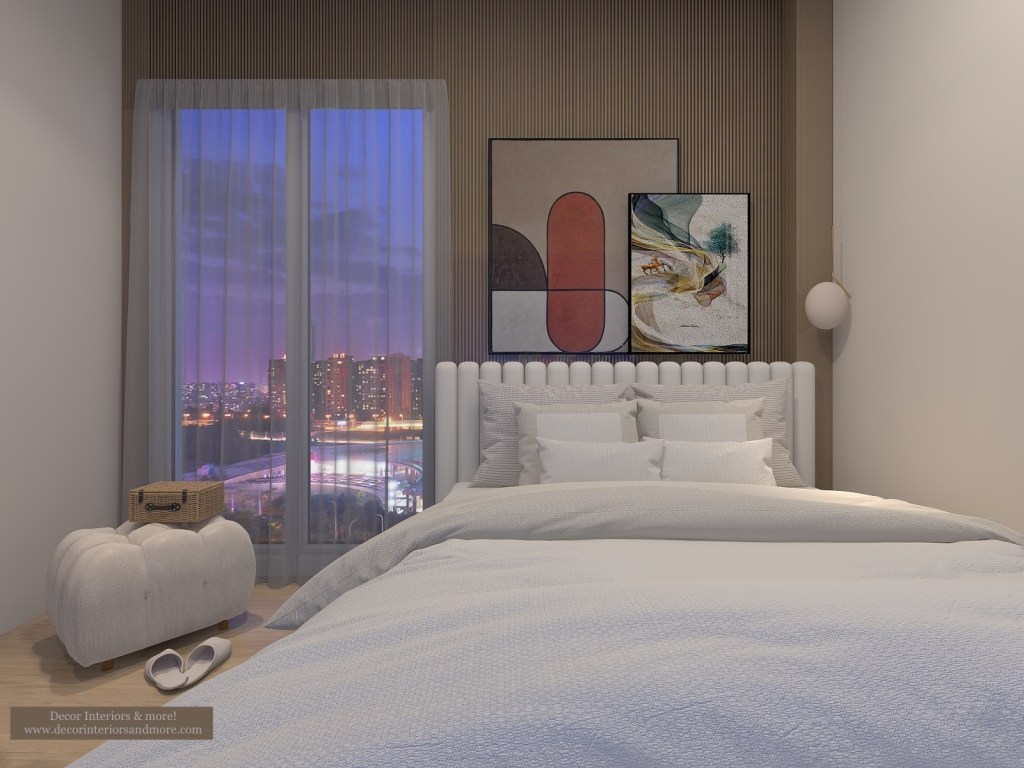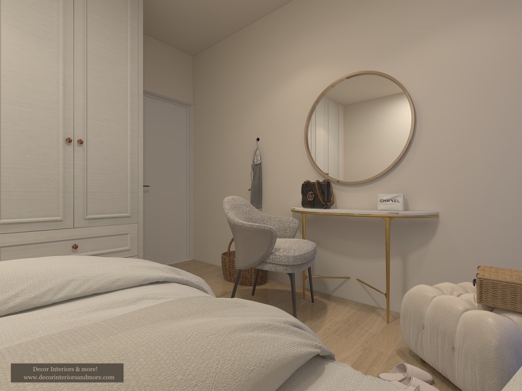 Η τρισδιάστατη απεικόνιση αφορά το κυρίως υπνοδωμάτιο σε ένα διαμέρισμα, όπου δεν είχαμε την άνεση χώρου. Καλύψαμε όμως όλες τις ανάγκες: λειτουργικές αλλά και μια αρμονικά καλαίσθητη συνολική εικόνα του δωματίου.