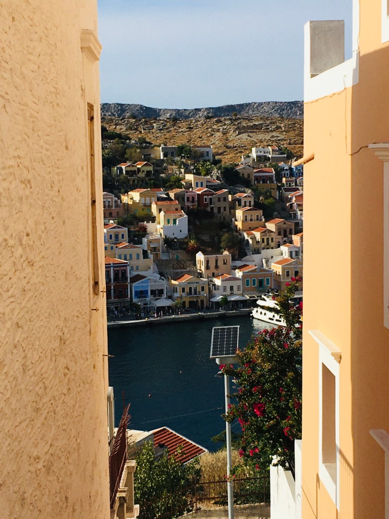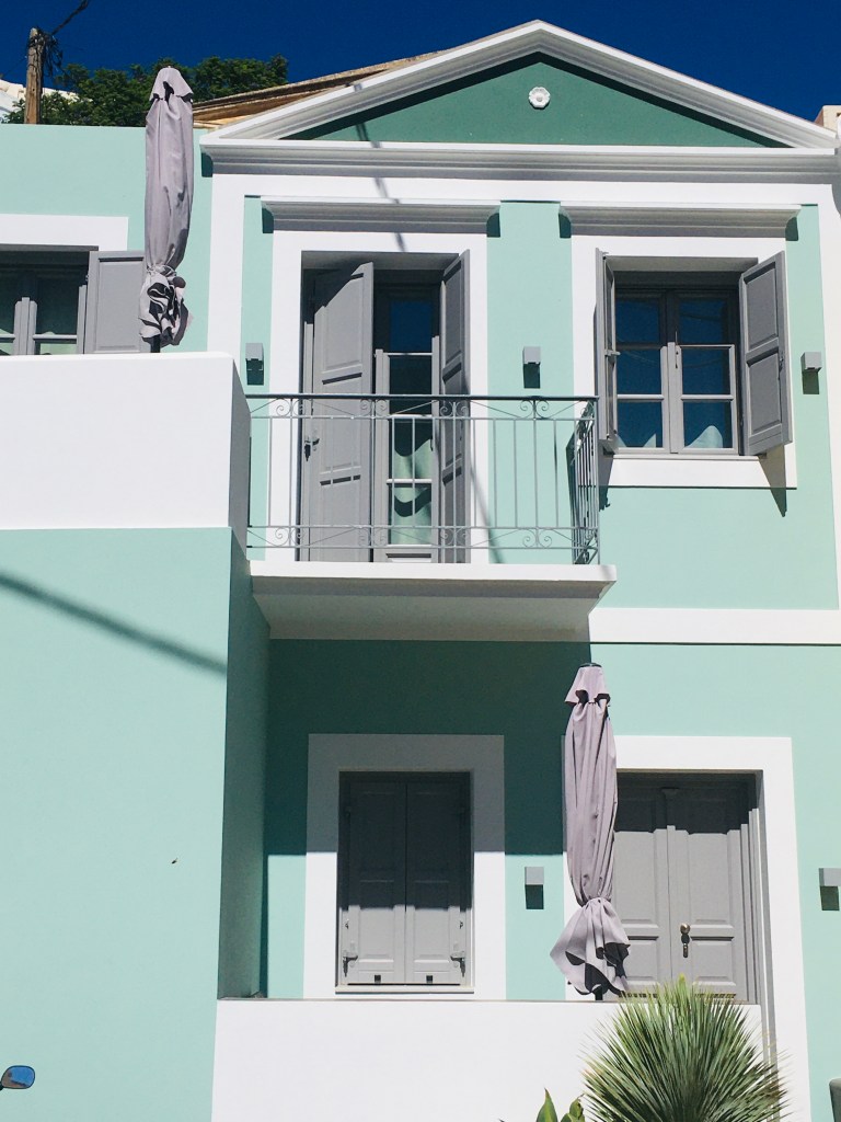 Χαρακτηριστική και ιδιαίτερα όμορφη η αρχιτεκτονική των κτιρίων στο γραφικό, νησί των δωδεκανήσων τη Σύμη. Κύριο χαρακτηριστικό, είναι χρωματκή παλέτα των παστέλ. Στέγες με κεραμύδι και αετώματα, οι προσόψεις με συμμετρικά ανοίγματα και υπέροχο συνδυασμό χρωμάτων. Κάθε οίκημα και οχι μόνο είναι δομημένο με απόλυτο σεβασμό στην αρχιτεκτονική κληρονομιά του νησιού.